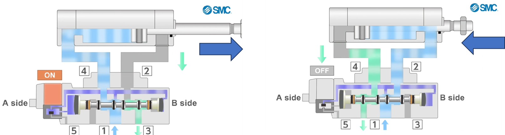 최초 에어를 1번으로 공급하면 On 아래의 솔레노이드 벨브가 열리면서 5번의 피스톤을 밀어 실린더가 나옵니다.