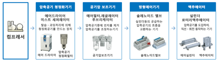 - 액추에이터 : 액추에이터란 압축공기를 이용하여 여러 운동을 하는 기기 입닌다. 현장에서는 주로 에어 실린더라고 부릅니다.
